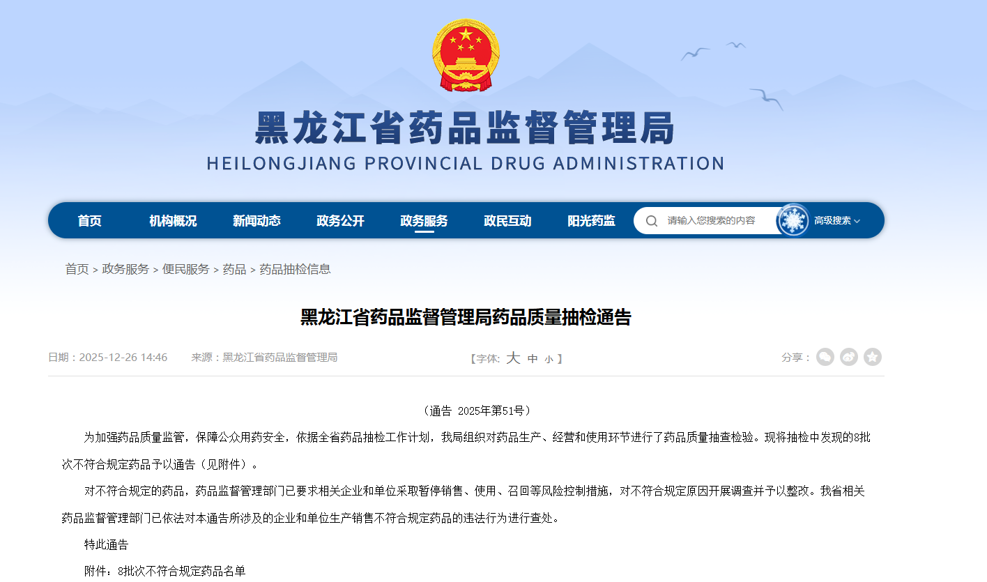 为加强药品质量监管,保障公众用药安全,依据全省药品抽检工作计划,我局组织对药品生产、经营和使用环节进行了药品质量抽查检验。现将抽检中发现的8批次不符合规定药品予以通告(见附件)。