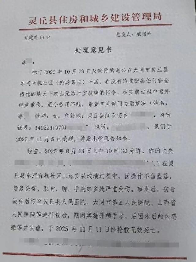 李女士介绍,此前她因丈夫工伤赔偿问题进行信访,2025年12月24日,她收到了灵丘县住建局下发的处理意见书。仔细查看后发现,文件上的户籍地并非自己实际居住的灵丘县落水河乡某村,而是被写成了灵丘县红石愣乡某村,两者毫无关联。