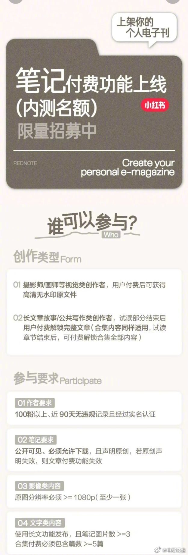 [#小红书回应内测笔记付费#[并不简单]]#小红书笔记付费#近日有消息称,小红书已悄然开启“笔记付费功能”内测。目前收费方式主要有三种,基本覆盖主流内容类型:一是高清原图付费下载,二是单篇笔记付费阅读,适合写深度干货、行业洞察、长篇故事或小说的作者。第三种则是笔记合集付费解锁,主要针对连载内容。小红书客服工作人员表示,笔记付费功能目前为平台邀约制,如果在APP系统页面看到相关提示可参与功能测试。小红书此举也被外界视为试水网文付费市场。(界面新闻)