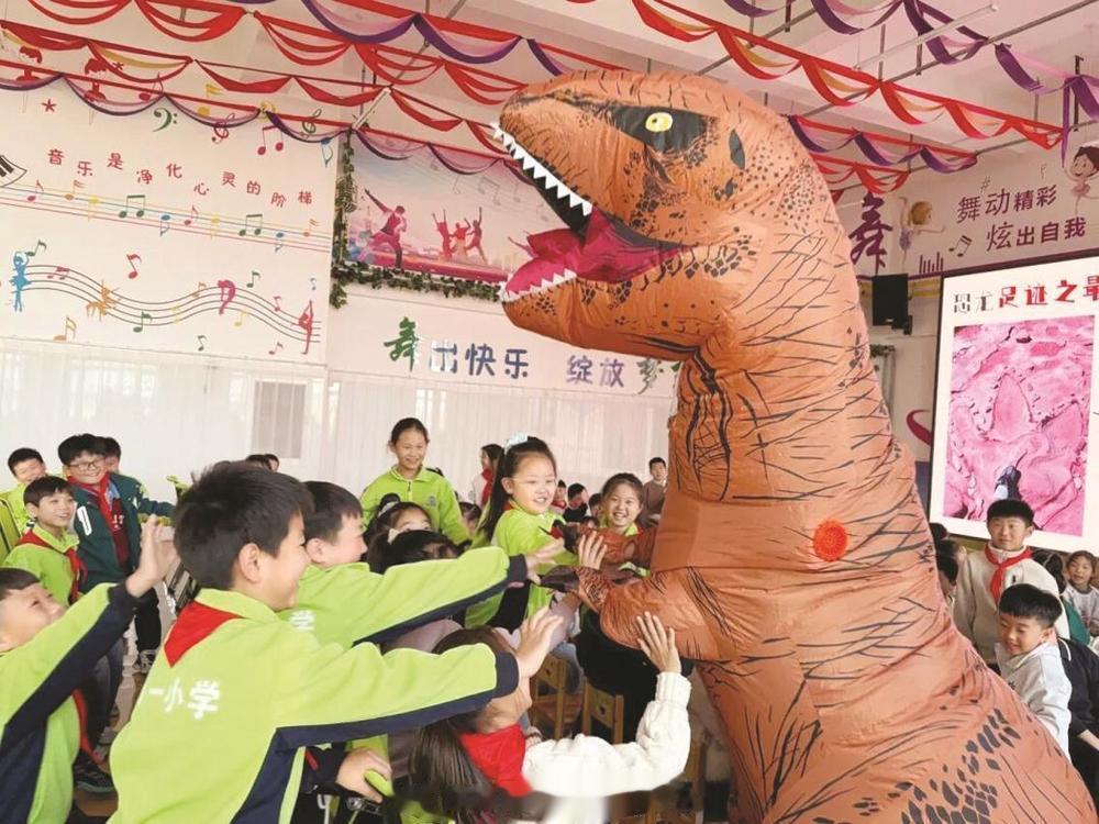 图为同学们与恐龙人偶互动。安赵泽摄