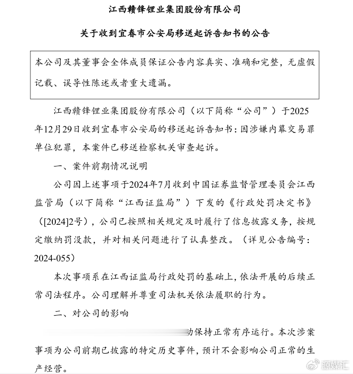 2025年12月30日,赣锋锂业公告称,因早年涉嫌内幕交易罪单位犯罪一事,目前已收到有关部门的移交起诉告知。