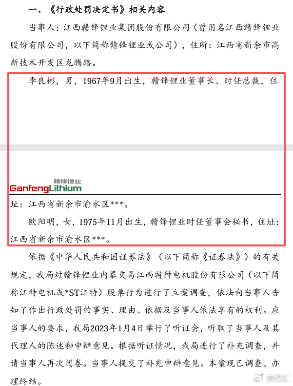 2022年1月,因涉嫌内幕交易证监会对赣锋锂业进行立案调查。源媒汇注意到,当年年底,另一内幕信息知情人时任江特电机副总裁兼董事会秘书闵某章配偶邬某珍,已因内幕交易江特电机股票被江西监管局处罚——没收其13.9万元违法所得,并罚款50万元。