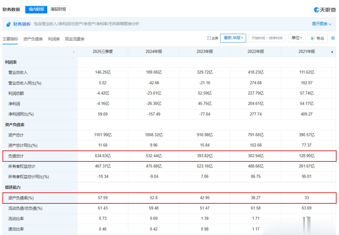 财务压力同步显现。天眼查显示,截至2025年三季度末,赣锋锂业的资产负债率约57.59%,总负债约634.63亿元,财务费用同比大增95%至10.28亿元。