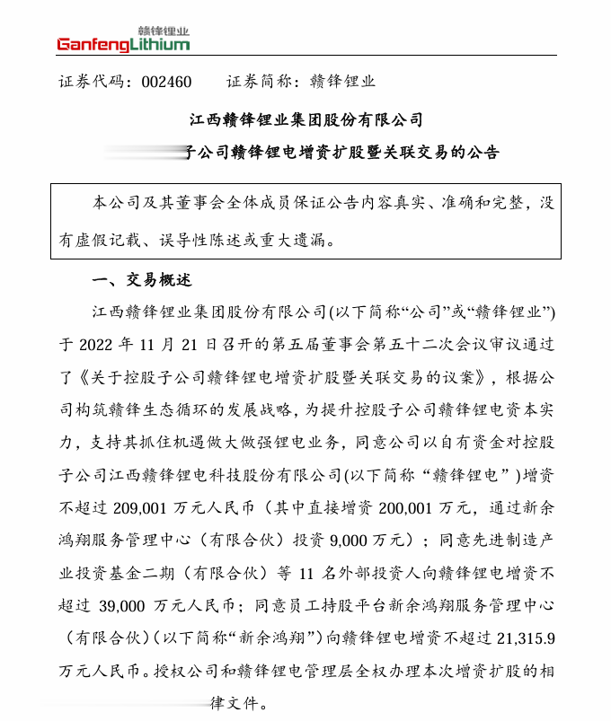 为推进赣锋锂电的分拆上市,赣锋锂业于2022年11月联手员工持股平台以及11名外部投资人,向其增资近27亿元。彼时,投资协议中明确包括对赌条款,要求赣锋锂电须在2025年年底前实现合规上市,否则实控人需回购投资人手中股份。