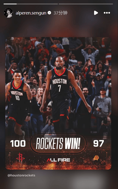 赛后,因伤缺阵的阿尔佩伦-申京在INS转发了杜兰特的海报。