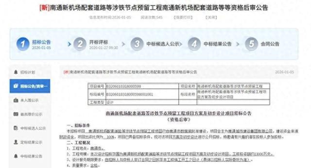 1月5日,南通市公共资源交易平台发布《南通新机场配套道路等涉铁节点预留工程项目方案及初步设计项目招标公告》和《海门北站综合交通枢纽项目招标公告》。根据设计任务书明确,南通新机场计划于2027年全面开工建设。与此同时,沪渝蓉沿江高铁也计划在2027年开通运行。