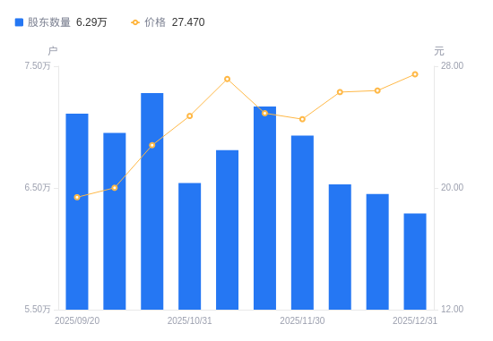 日期A股户数(户)流通A股户均持股数(股)户均持股市值(万元)2025-12-316290035731.4898.152025-12-206450034845.1291.992025-12-106530034418.2390.522025-11-306930032431.6179.522025-11-207170031346.0378.082025-11-106810033003.0989.642025-10-316540034365.6084.992025-10-207280030874.3970.422025-09-306951632332.9264.702025-09-207110031612.5961.30