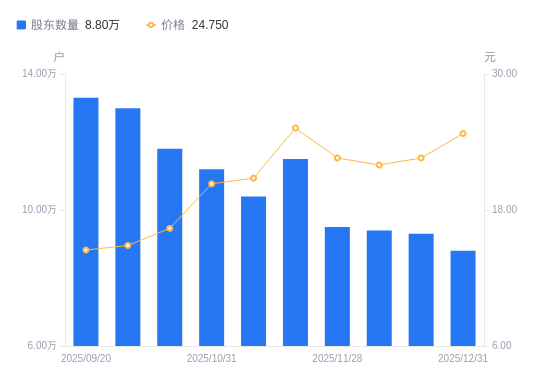 日期A股户数(户)流通A股户均持股数(股)户均持股市值(万元)2025-12-318800012028.9929.772025-12-199300011382.2725.712025-12-109400011261.1824.742025-11-289500011142.6525.172025-11-201150009204.7923.222025-11-1010400010178.3821.182025-10-311120009451.3519.202025-10-201180008970.7714.692025-09-301299298147.1512.112025-09-201330007959.0311.52