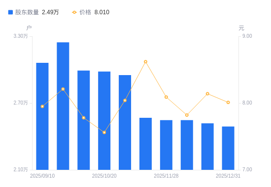 日期A股户数(户)流通A股户均持股数(股)户均持股市值(万元)2025-12-312489812607.9410.102025-12-192518312465.2510.152025-12-102546412327.709.642025-11-282546612326.739.972025-11-202567612225.9110.542025-10-312952010633.898.552025-10-202983310522.327.952025-09-302992510489.978.162025-09-19324659669.267.942025-09-103062110251.548.15
