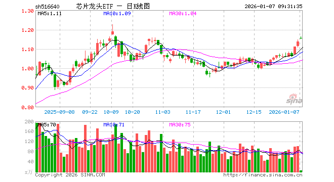 1月7日,芯片龙头ETF(516640)开盘涨1.76%,报1.156元。芯片龙头ETF(516640)重仓股方面,中芯国际开盘涨0.00%,寒武纪跌0.95%,海光信息涨0.00%,北方华创涨1.45%,澜起科技涨5.60%,兆易创新涨7.66%,中微公司涨3.10%,豪威集团涨0.70%,芯原股份涨2.82%,长电科技涨1.61%。