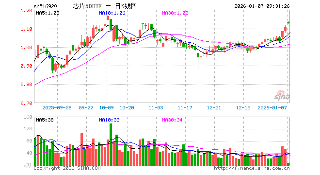 1月7日,芯片50ETF(516920)开盘涨2.17%,报1.130元。芯片50ETF(516920)重仓股方面,中芯国际开盘涨0.00%,寒武纪跌0.95%,海光信息涨0.00%,北方华创涨1.45%,澜起科技涨5.60%,兆易创新涨7.66%,中微公司涨3.10%,豪威集团涨0.70%,芯原股份涨2.82%,长电科技涨1.61%。