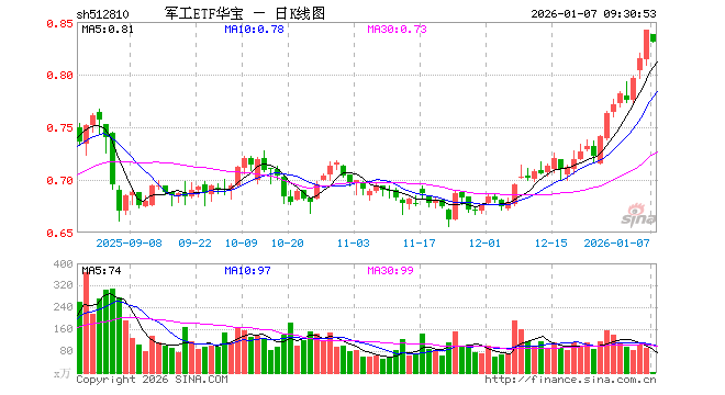 1月7日,军工ETF华宝(512810)开盘跌0.48%,报0.838元。军工ETF华宝(512810)重仓股方面,中国船舶开盘跌0.17%,中航沈飞跌0.18%,光启技术涨1.09%,航发动力跌0.85%,中航光电涨0.73%,中航西飞涨0.35%,中国长城涨0.07%,菲利华跌3.75%,睿创微纳跌0.21%,航天电子跌1.80%。