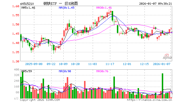 1月7日,钢铁ETF(515210)开盘涨0.00%,报1.472元。钢铁ETF(515210)重仓股方面,包钢股份开盘涨1.59%,宝钢股份跌0.54%,华菱钢铁涨0.90%,久立特材跌0.34%,中信特钢涨0.00%,杭钢股份涨0.12%,南钢股份涨0.38%,河钢股份涨0.00%,沙钢股份涨0.00%,马钢股份涨0.24%。