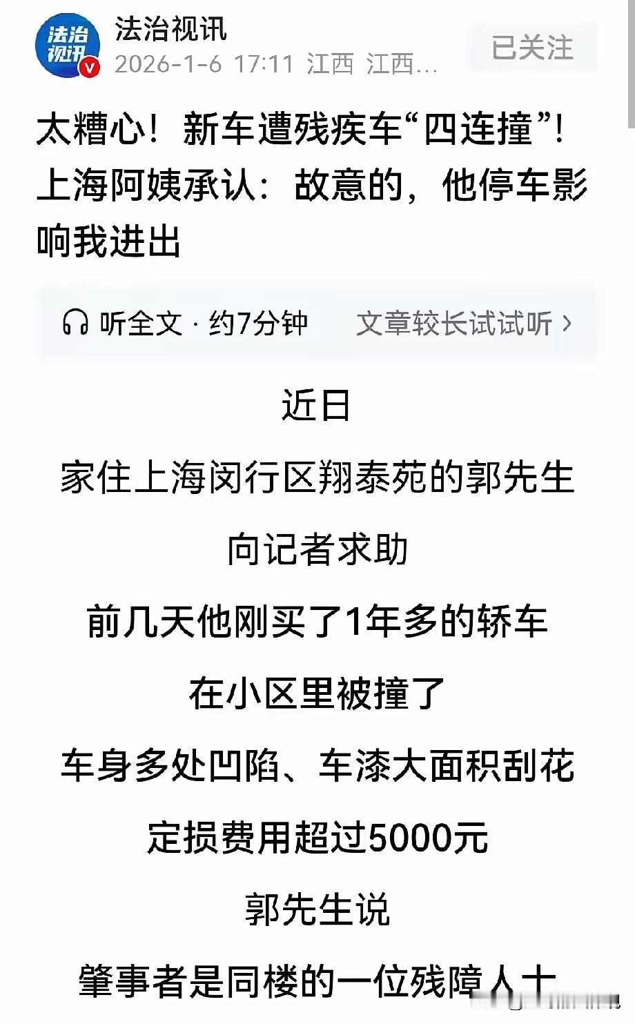 上海,男子正在家休息,突然收到自己爱车的报警,赶紧跑下楼查看,发现自己刚买了一年多的新车,右侧整个车身被撞的面目全非。经过查看监控,发现是住同楼的一位残疾阿姨,开着自己的残障人专用车,连续4次故意撞向男子的车,事后,仗着自己残疾态度强硬。经鉴定,车辆损失超5000元, 男子不原谅不、不和解。网友:残疾是有原因的。 这位男子姓郭,新车才开一年多,平时爱护得跟宝贝似的。跑到楼下看到车的瞬间,他血压都上来了——右侧车门凹得能塞进拳头,车漆刮得没一块好地方,轮毂都变了形。 监控里的画面更让人气愤!阿姨开着残疾车驶出车位,特意折返三次调整角度,一次比一次用力地撞上去,整整四次,车被撞得不停摇晃。 郭先生说自己停车时只是车头超了50厘米,保安都能证明不影响通行。可阿姨不依不饶,前一天就因为这事争执了好几次,转头就用撞车泄愤。 更过分的是事后态度!阿姨一口咬定郭先生占了她的“专属车位”,还说“我是残疾人,你能把我怎么样”。可物业澄清,那是公共车位,所谓的“无障碍标识”是她私设的。 社区早就给阿姨安排了非机动车棚的无障碍车位,她嫌远不接受,硬是霸占公共通道划禁停线,还放路桩占车位。这哪里是需要照顾,分明是仗着残疾耍特权! 律师说了,车损超5000元已经达到故意毁坏财物罪的立案标准,就算是残疾人,也不能免责。法律面前人人平等,残疾不是肆意损害他人财物的“免罪金牌”。 郭先生坚决不和解,真的太能理解了!换谁的新车被这么故意糟蹋,对方还毫无悔意,都咽不下这口气。尊重残疾人是本分,但尊重从来都是相互的。 小区停车难是普遍问题,但再难也得守规矩。阿姨的行为不仅伤了邻里情分,还触犯了法律,最后自己也得承担后果——现在她已经把残疾车挪去了社区安排的车位,私设的标识也撤了。 这件事也给所有小区提了个醒:无障碍保障要到位,但管理更得规范。不能因为对方是特殊群体就放任不管,不然既伤了其他业主的心,也容易让特殊群体养成“特权思维”。 各位读者你们怎么看?欢迎在评论区讨论。