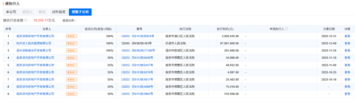 其中,控股子公司杭州滨上投资管理有限公司于2026年初被乐清市法院列为被执行人,单案执行金额高达9780万元,占总执行金额的61%;全资子公司南京滨晖房地产开发有限公司、温州滨致建设开发有限公司,以及控股子公司南京滨鸿房地产开发有限公司,均在2025年出现多条被执行记录,涉及合同纠纷、工程款支付等多项案由。