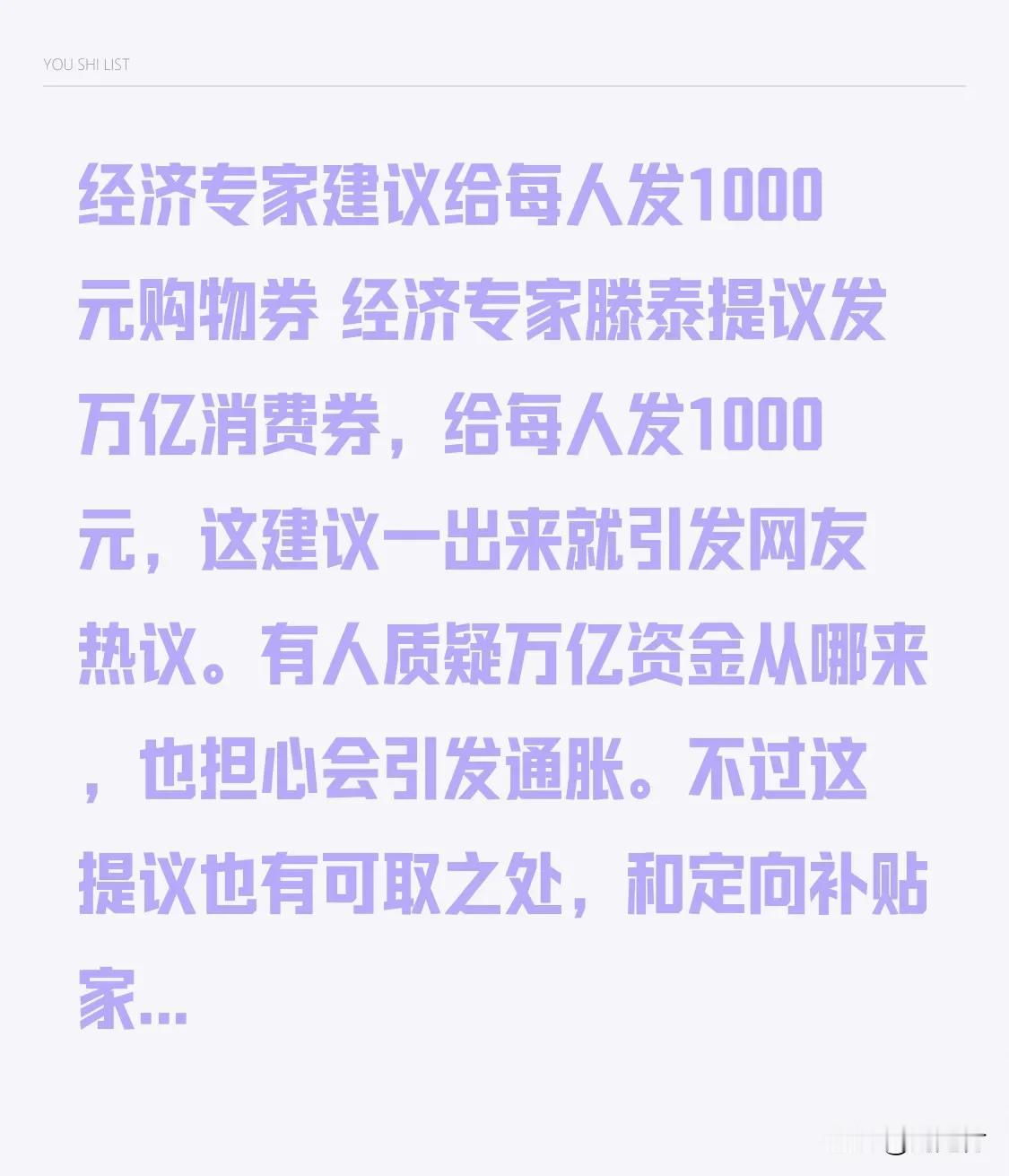 经济专家建议给每人发1000元购物券 经济专家滕泰提议发放万亿消费券,给每人发1000元,此建议一出便引发网友热议。有人质疑万亿资金来源,担心会引发通胀。不过该提议有可取之处,与定向补贴家电、汽车模式相比,通用消费券让消费者自主决定消费方向,避免了诸多尴尬。 有宝妈网友认为这对底层家庭很实在,一家三口仅靠老公一人打工赚钱,1000元能支付大半个月菜钱,还能给孩子买绘本,比高端家电补贴实用得多。虽说这建议存在争议,但倘若能实施,或许真能刺激消费,让老百姓受益。 电子消费券