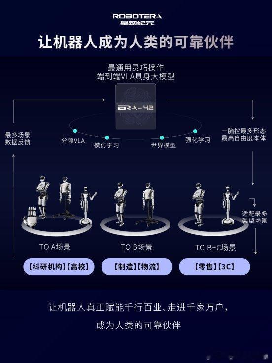 星动纪元基于软硬件一体化全栈自研,构建起“模型-本体-场景数据”的物理世界AI闭环飞轮——将自研端到端VLA具身大模型ERA-42与人形机器人家族产品深度融合,实现数据采集、模型训练、场景落地的正向循环。