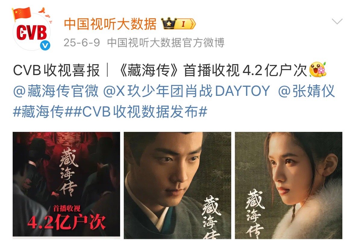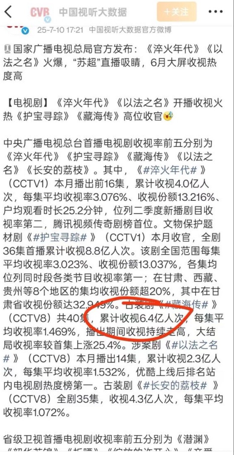 CVB中国视听大数据官方发了两次藏海传的收视率:第一次首播收视4.2亿户次。第二