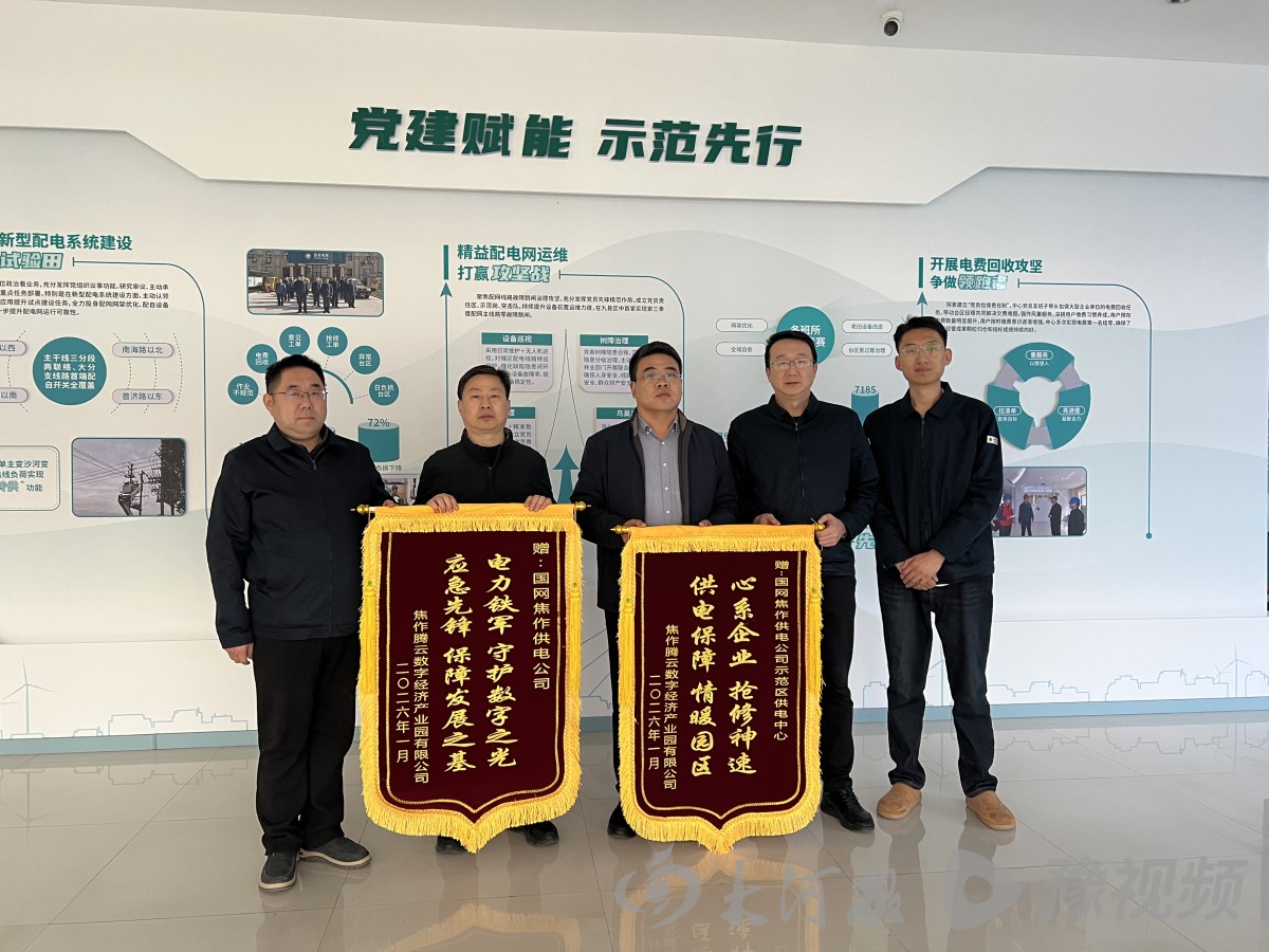 1月5日上午,焦作腾云数字经济产业园负责人一行将一面印有“心系企业抢修神速供电保障情暖园区”的锦旗及一封感谢信送至国网焦作供电公司示范区供电中心,以真挚情谊致谢该公司在危急时刻为园区提供的坚实电力保障。