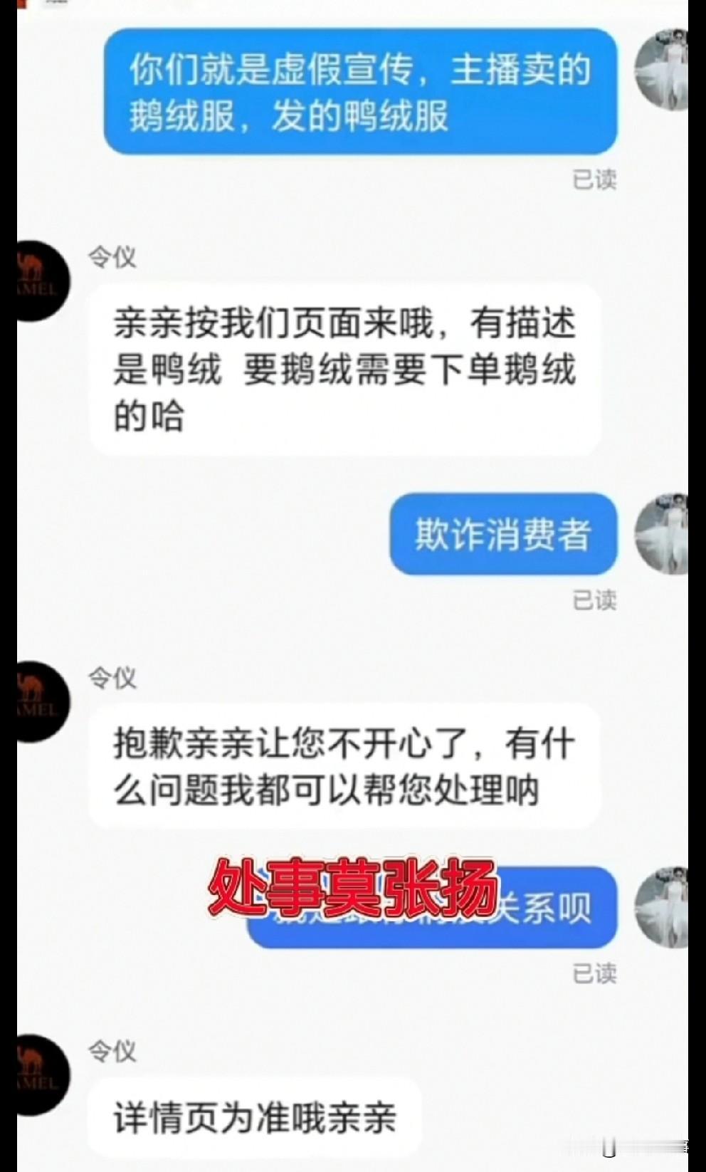 粉丝吐槽在蛋蛋直播间购买鹅绒服,收到后变成鸭绒服! 有粉丝发视频声称,在蛋蛋直播间购买鹅绒服,收到后却是鸭绒服,并且直播时也是介绍的鹅绒服,找客服也不太理人,并且就是打太极!