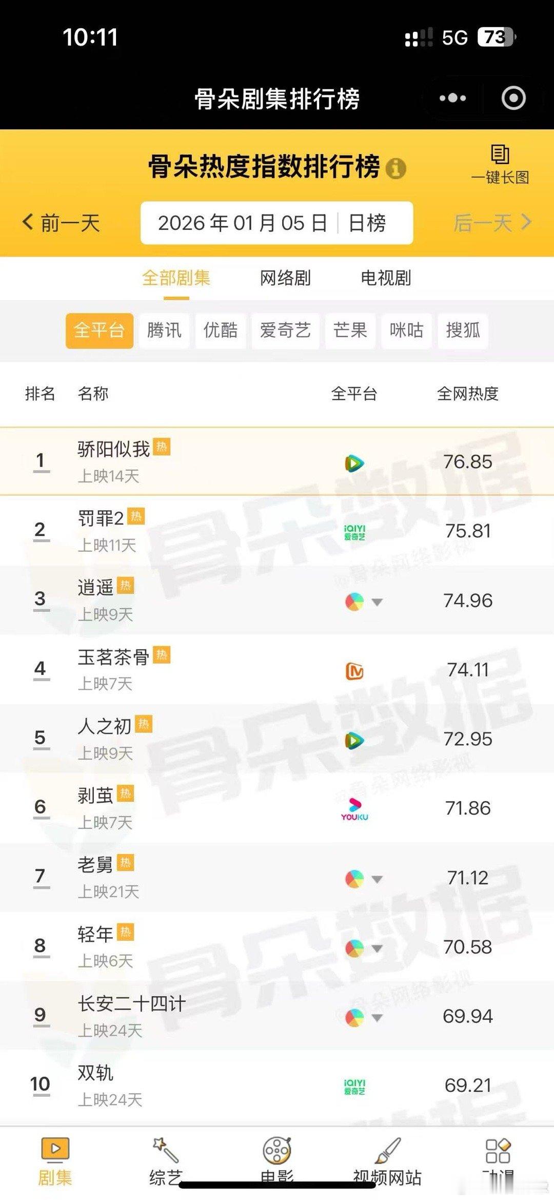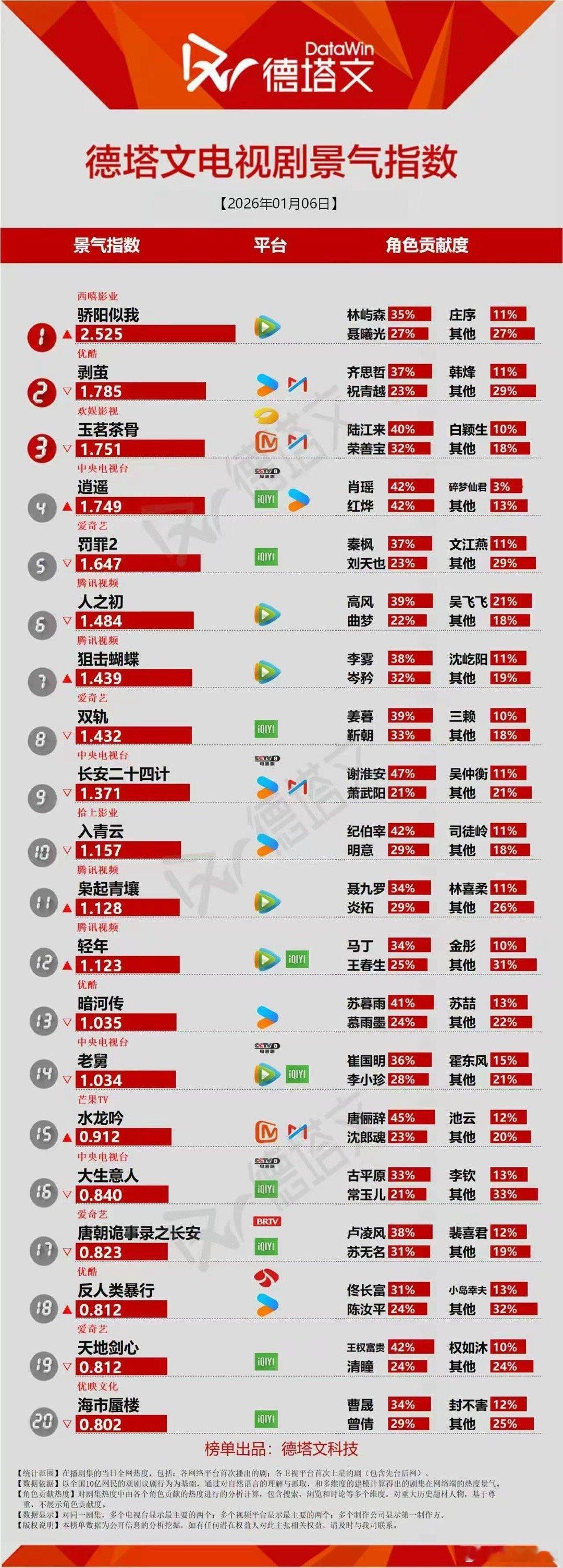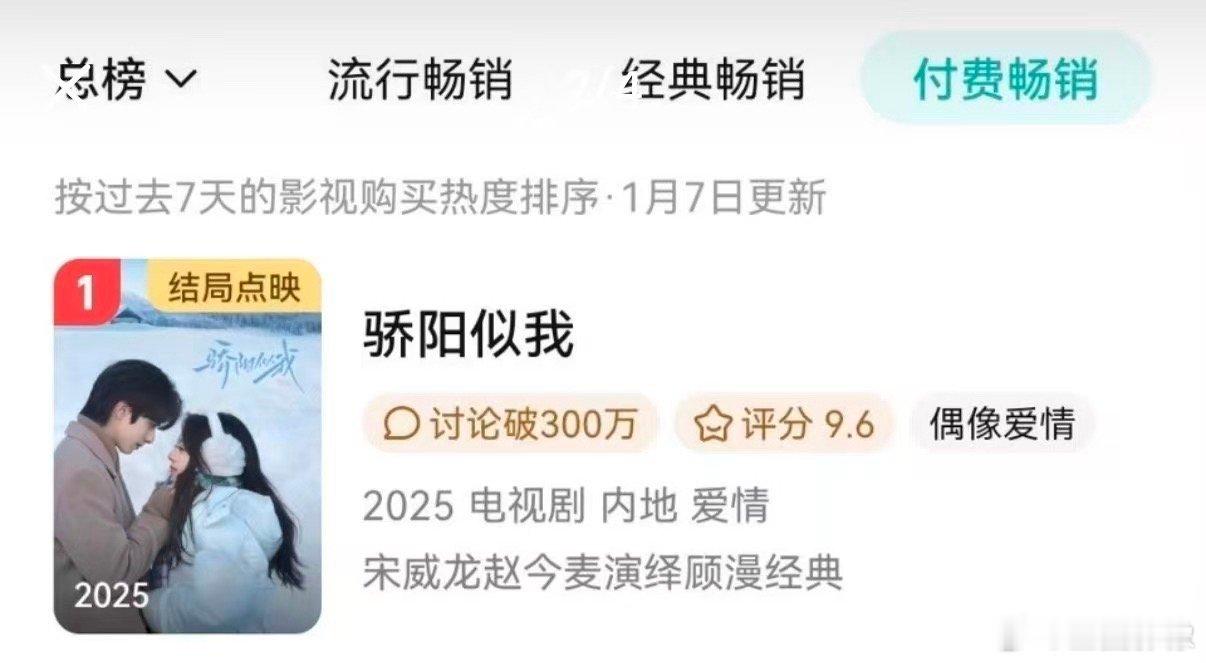 骄阳似我 是真火了,数据全线登顶!不仅站内破3万热度,还有猫眼总榜连续7天TOP1,德塔文、Vlinkage连续13天TOP1,骨朵、蓝鹰、酷云等多纬度数据霸榜,拉新成绩也相当能打,付费畅销榜TOP1,年榜23,涨幅72.7.真🔥爆剧从不靠单平台定义,各维度第一摆在这儿,观众心里自有骄阳。 骄阳似我成绩