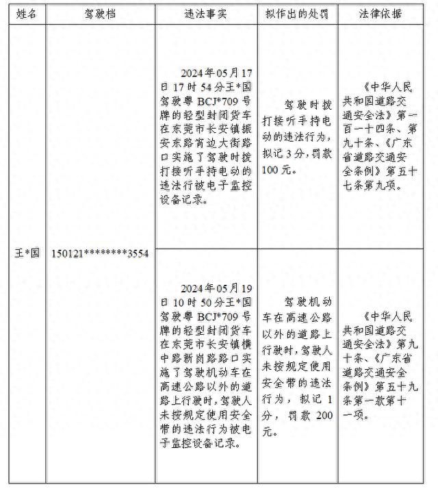 机动车驾驶人王*国,驾驶深圳市吉*汽车科技有限公司的粤BCJ*709的小型新能源汽车,因道路交通违法行为被电子监控设备记录,当事人未在限定期限内接受处理。根据《中华人民共和国行政处罚法》第四十四条、《公安机关办理行政案件程序规定》第一百六十八条等规定,现将其对应违法事实、理由和处罚依据公告告知如下,根据《中华人民共和国行政处罚法》第四十五条的规定,当事人有提出陈述与申辩的权利。如要提出陈述和申辩,请自公告之日起七日内向东莞市公安局交通管理支队长安大队(地址:东莞市长安镇厦边尚警街2号;联系人:陆警官、林警官,联系电话:0769-81661611)提出,逾期不提出的视为放弃陈述与申辩。(清单附后)