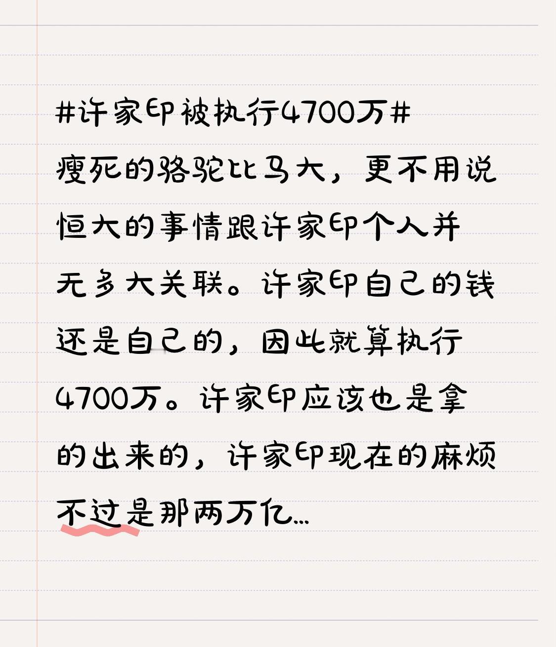 许家印被执行4700万瘦死的骆驼比马大,更不用说恒大的事情跟许家印个人并无多大关联。许家印自己的钱还是自己的,因此就算执行4700万。许家印应该也是拿的出来的,许家印现在的麻烦不过是那两万亿贷款,已经全国各地的烂尾楼而已。