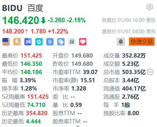 格隆汇1月7日|百度(BIDU.US)盘前涨1.22%,报148.2美元。消息面上,1月6日,百度旗下萝卜快跑正式获得迪拜道路与交通管理局(RTA)颁发的全无人驾驶测试许可,成为迪拜首个且目前唯一获准开展全无人测试的平台。同日,萝卜快跑在海外建设的首个无人驾驶一体化运营基地于迪拜正式启用。此外,有媒体援引消息人士称,百度旗下人工智能芯片部门昆仑芯据悉计划通过香港IPO融资至多20亿美元。(格隆汇)