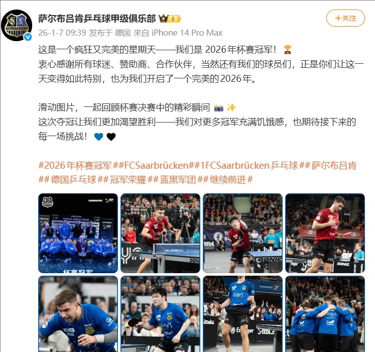 萨尔布吕肯乒乓球甲级俱乐部写道:“这是一个疯狂又完美的星期天——我们是2026年杯赛冠军!”