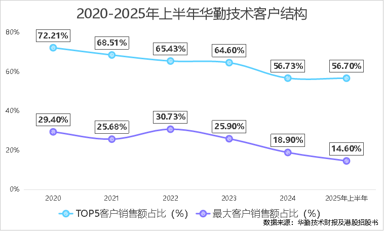 近年来,华勤技术在各大客户销售额均上升的情况下,实现了TOP5客户收入占比的逐年下降。从2020年的72.21%,直降到了2025年上半年的56.70%,5年间下降了近20个百分点。