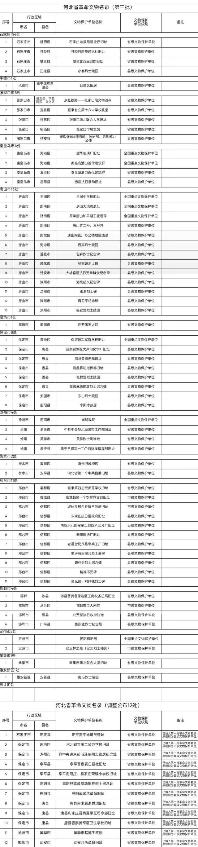 从河北省文物局获悉,河北省第三批革命文物名录日前公布,包括各级文物保护单位共计61处,同时对12处已公布为革命文物的文物保护单位级别进行了调整。