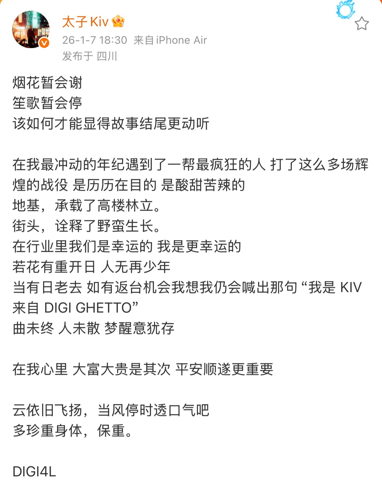 sakee asen 终于!太子Kiv也发声了:“在我最冲动的年纪遇到了一帮最疯狂的人 打了这么多场辉煌的战役 是历历在目的 是酸甜苦辣的地基,承载了高楼林立。街头,诠释了野蛮生长。在行业里我们是幸运的 我是更幸运的 若花有重开日 人无再少年当有日老去 如有返台机会我想我仍会喊出那句“我是 KIV 来自 DIGI GHETTO” 曲未终 人未散 梦醒意犹存在我心里 大富大贵是其次 平安顺遂更重要云依旧飞扬,当风停时透口气吧多珍重身体,保重。”digighetto