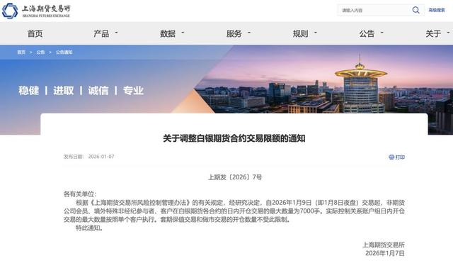 上期所同时发布关于调整白银期货合约交易限额的通知。通知称,根据《上海期货交易所风险控制管理办法》的有关规定,经研究决定,自2026年1月9日(即1月8日夜盘)交易起,非期货公司会员、境外特殊非经纪参与者、客户在白银期货各合约的日内开仓交易的最大数量为7000手。实际控制关系账户组日内开仓交易的最大数量按照单个客户执行。套期保值交易和做市交易的开仓数量不受此限制。