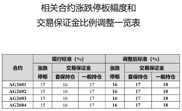 上期所还调整了白银期货相关合约交易保证金比例和涨跌停板幅度。根据通知,自2026年1月9日(星期五)收盘结算时起,交易保证金比例和涨跌停板幅度调整如下:白银期货AG2601、AG2602、AG2603、AG2604合约的涨跌停板幅度调整为16%,套保持仓交易保证金比例调整为17%,一般持仓交易保证金比例调整为18%。