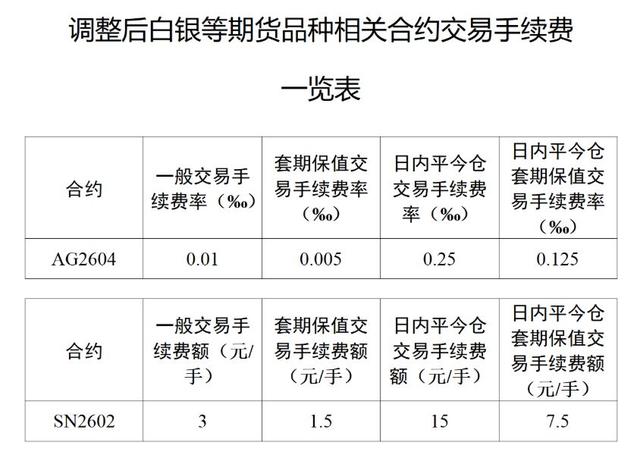 此外,上期所调整白银等期货品种相关合约交易手续费。根据通知,自2026年1月9日交易(即1月8日晚夜盘)起:白银期货AG2604合约日内平今仓交易手续费调整为成交金额的万分之二点五。锡期货SN2602合约日内平今仓交易手续费调整为15元/手。