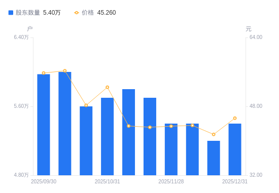 日期A股户数(户)流通A股户均持股数(股)户均持股市值(万元)2025-12-31540004991.4722.592025-12-19520005183.4521.512025-12-10540004991.4721.752025-11-28540004991.4721.662025-11-20570004728.7620.402025-11-10580004644.4920.182025-10-31570004725.9824.792025-10-20560004810.3723.212025-10-10600004489.6825.262025-09-30597284510.1225.14