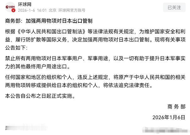 中国出手反制了!正在窜访的汉奸石平被狠狠的打了一记耳光!在我们通过军演发出震慑性消息,明确表示,我们绝不允许域外势力干涉我们的内政之后,没想到日本议员石平仍旧“顶风作案”,悍然窜访台湾。就在石平窜访当天,我们对日本进行反制。1月6日,我们商务部发表对日反制公告。 这场石平自导自演的闹剧,最后只能是搬起石头砸自己的脚,狠狠打了自己一耳光,就在解放军“正义使命-2025”联合演习的火药味还没散干净的时候,这个早就把自己钉在耻辱柱上的石平,竟然还想搞一次所谓的“高调”台湾之行,给他在政治上已经透支得差不多的老脸贴贴金。 结果一点都不意外:他人还没等到在岛内所谓的“风光时刻”,中国这边一记重拳就已经结结实实地砸向了他背后的“靠山”。 外交部发言人毛宁只用了八个字就把他评价完了:“宵小狂言,不值一评”。 这八个字就像手术刀一样,一下子就扒掉了石平身上那层“日本参议员”的假皮,露出了他不管走到哪都改不了的本色。 想想他当年也是四川才子、北大高材生,拿着公派名额去日本留学,结果后来居然数典忘祖,否认南京大屠杀,靠抹黑自己的祖国向日本右翼交“投名状”,他这一路走来,每一步都是踩在同胞的血泪和良知上。 现在他甚至把“能不能入境台湾”这种行政手续,强行扯成什么所谓的“主权试金石”,这种荒唐逻辑除了再一次证明他的底线早就烂没了,一点意义都没有。 但这出戏最讽刺的地方在于,演员在前面卖力吆喝,却不知道后台的道具箱早就被人搬空了,就在1月6日石平还在为去台湾做最后挣扎的时候,中国商务部的反制公告紧跟着就出来了。 这一次,可不再是口头警告那么简单,而是直接打到了日本某些势力的七寸上:两用物项出口管制。这绝对不是巧合,而是一场经过精密计算的降维打击。 要是说去年9月那次针对石平个人的制裁,冻结他在国内的资产、不准他和亲属入境、断绝商业往来,是点穴,让他成了在中国“没家可回、没钱可花”的孤魂野鬼,那这次1月6日落地的出口管制就是断腕。 针对日本军事用户、军事用途,还有任何可能帮日本增强军事实力的最终用户,中国直接拉起了“高压线”。 谁敢把相关东西转给日方,谁就要准备好承担像雷劈一样的法律后果,这才是大国博弈的玩法:你派个小卒子过河来捣乱,我就把你后方运钢铁的桥给炸断。 现在的局面,不光是石平尴尬,连他在岛内想勾搭的那帮人也尴尬得不行,台湾当局表面上好像对他表示“欢迎”,其实那个烫手山芋拿在手里都在发抖。 他们心里比谁都清楚,这场窜访除了惹毛大陆、招来更猛烈的反制之外,没有任何实质性的“国际支持”意义。 所谓的入台许可,在这个节骨眼上,更像是一道催命符,发也不是,不发也不是,毕竟,解放军东部战区刚搞完覆盖海空的实战化演练,那不光是震慑“台独”,更是给所有想插手台海的域外势力上的一堂实景教学课。 石平想给日本右翼当刀使,结果却成了被抛弃的废铁,他在日本政治圈混了这么多年,到现在也不过是右翼势力手里的耗材,用来试探中国底线的,可一旦真的碰到了中国的核心利益,遭到了这种系统性的经济和战略反击,那些平时捧着他的势力肯定会权衡利弊,不仅不会给他实质性保护,反而会为了保住供应链和经贸大局慢慢把他边缘化。 一个在出生地被人唾弃、在归化国被人利用而且正在失去利用价值的人,这大概就是汉奸最后必然走向的凄凉结局。 回头看看,中国的反制手段真是展现出了极高的战略定力与执行力,一边是军舰战机在海峡划出不可逾越的红线,展示硬实力的雷霆万钧,一边是商务部的一纸公告,掐断潜在对手军事扩张的物质基础,展示软实力的精准冷酷。 从个人层面的“社会性死亡”和经济封锁,到国家层面的战略物资出口管制,这一套组合拳打下来,清清楚楚地告诉全世界:任何人在台湾问题上玩火,任何试图阻挠统一的外部干涉,那个代价都是他们承受不起的。 石平这趟窜访,除了让他自己的历史污点更黑一点、让日本某些产业的日子更难过一点之外,注定改变不了任何大势。 信源:环球网
