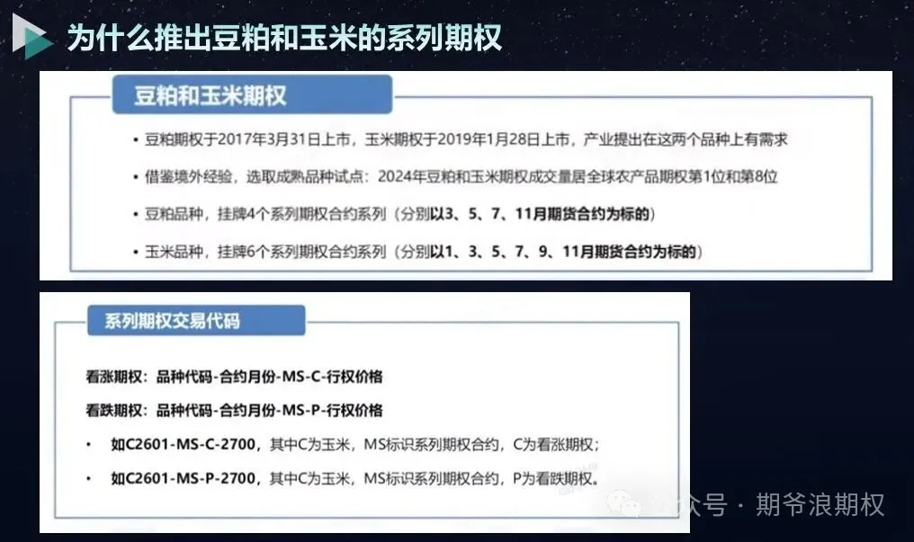 2024年,豆粕和玉米期权成交量居全球农产品期权的第1位和第8位。大商所推出豆粕和玉米系列期权,是为了丰富期权市场的期限结构,使得期权合约覆盖满全年12个月,满足个人和企业投资者的需求。