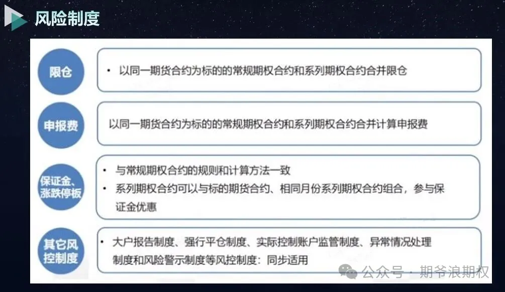 关于豆粕和玉米系列期权的挂牌基准价、行权价、结算价、手续费、行权履约、移仓、限仓、申报费、保证金、涨跌停板,以及其他风险制度等规则,详看下面的图片。