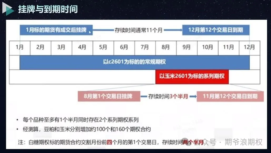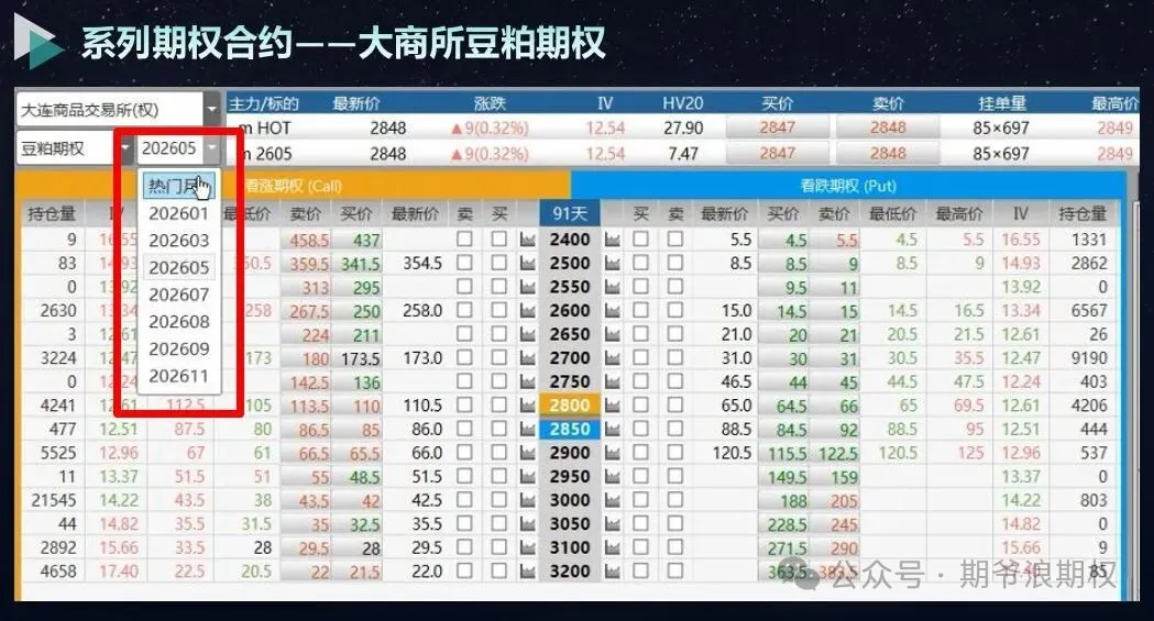 举个例子,2607豆粕期货合约对应2607期权合约,这个合约在6月的第12个交易日到期,这个是“常规期权”。2月2日即将上市的“系列期权”,标的期货也是2607的豆粕和玉米期货,但是2607系列期权的到期日是5月的第12个交易日。