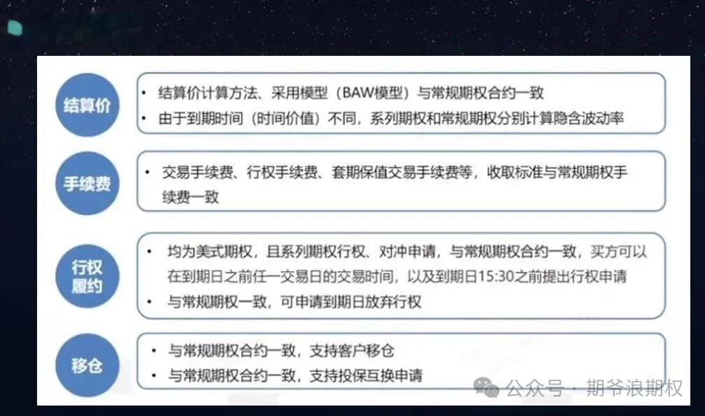 “常规期权”一般会提前1年挂出,而“系列期权”通常在在距离到期日3个月左右挂牌上市,续存时间3个半月。
