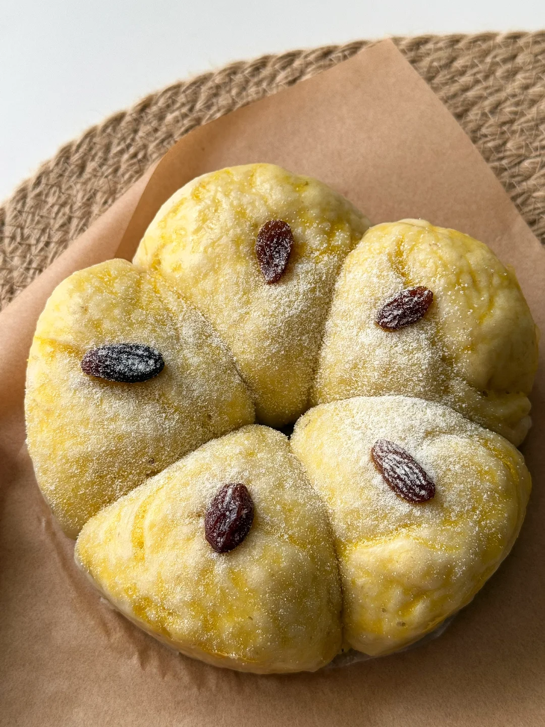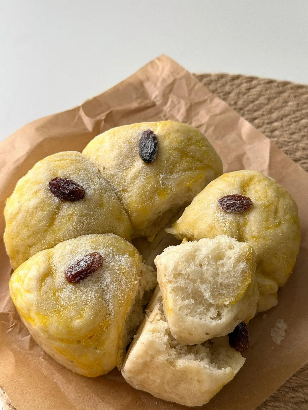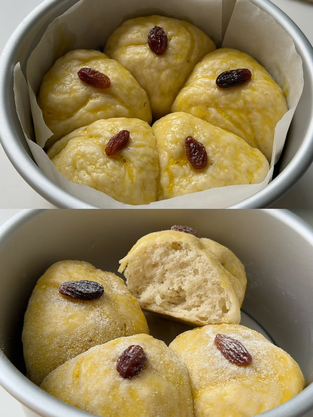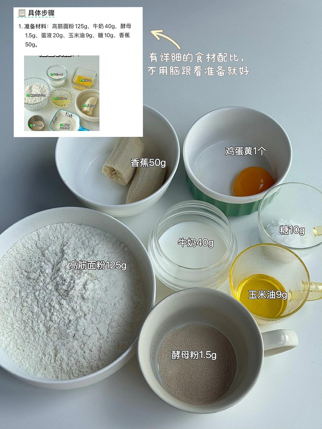 [向右R]食材:高筋面粉125g、酵母粉1.5g、香蕉50g、玉米油9g、牛奶40g、糖10g(可不加)、鸡蛋黄1个(用于涂抹表面)