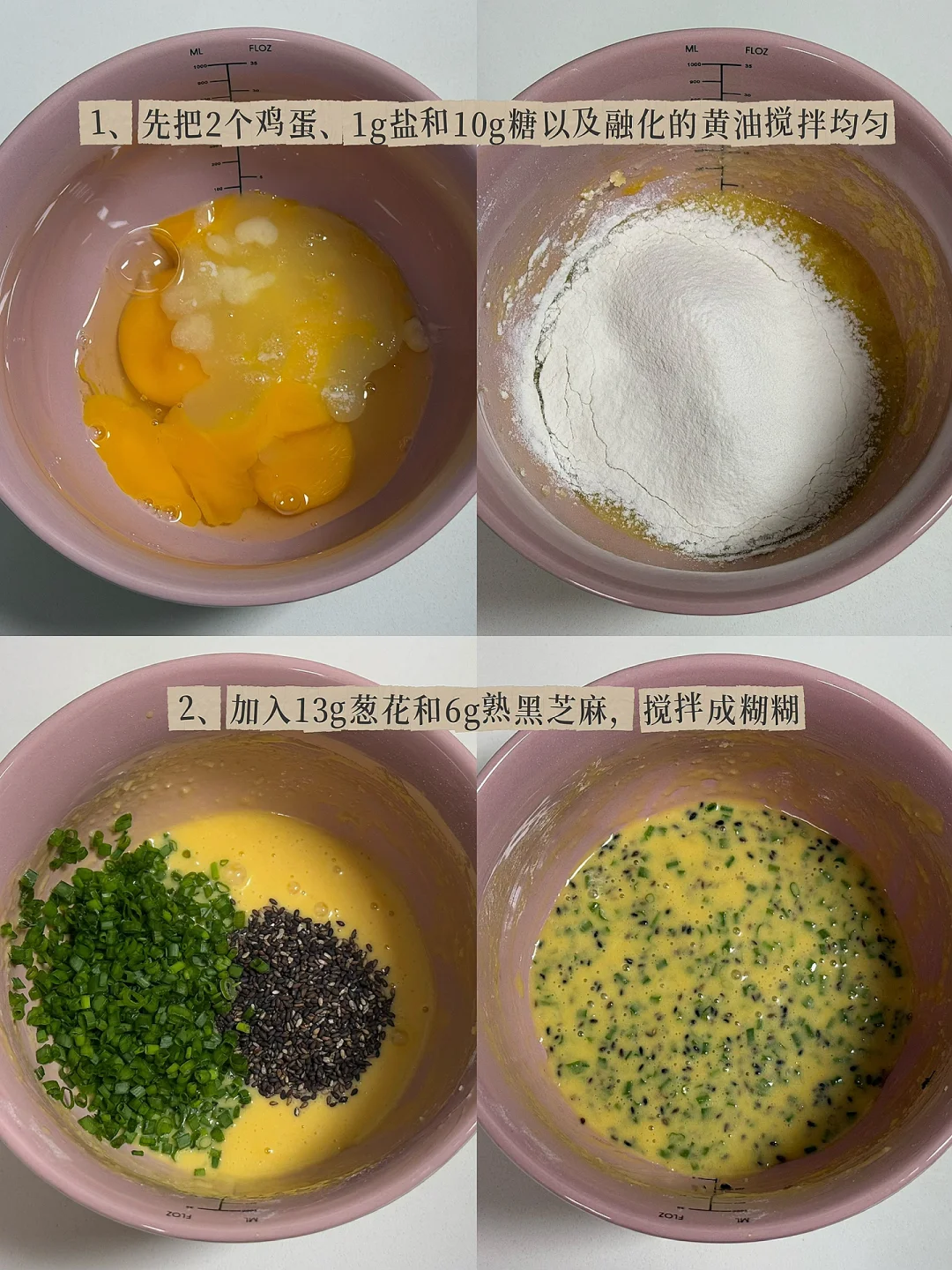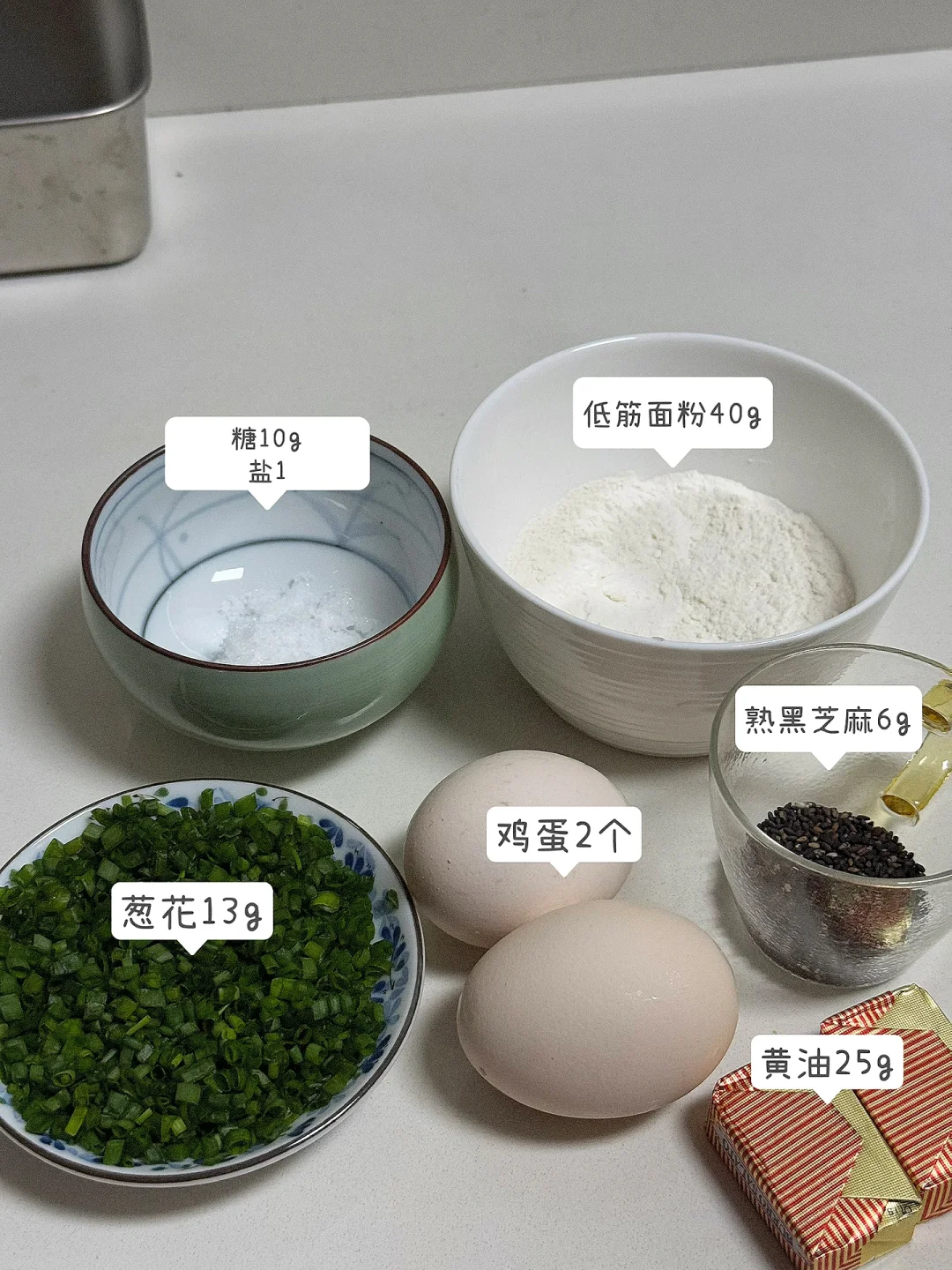 [向右R]食材:鸡蛋2个、低筋面粉40g、葱花13g、熟黑芝麻6g、代糖10g、盐1g、黄油25g