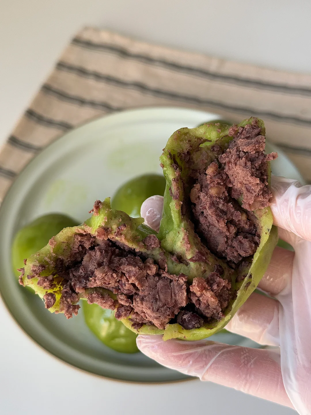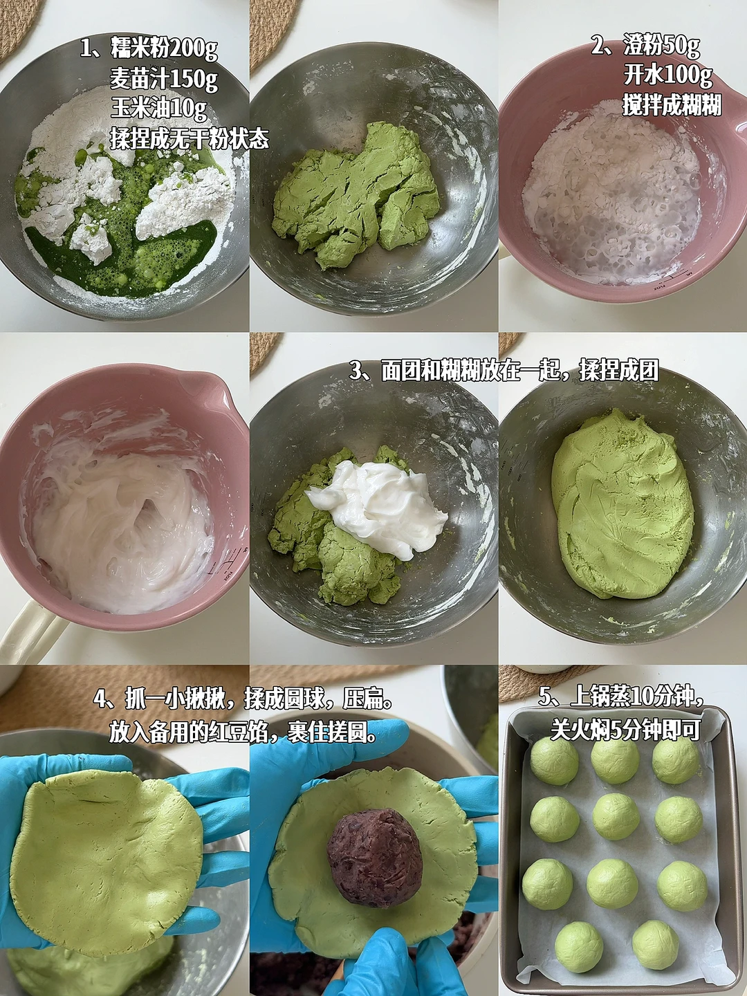 [向右R]外皮食材:糯米粉200g、麦苗汁150g、玉米油10g、澄粉50g、开水100g、糖粉20g