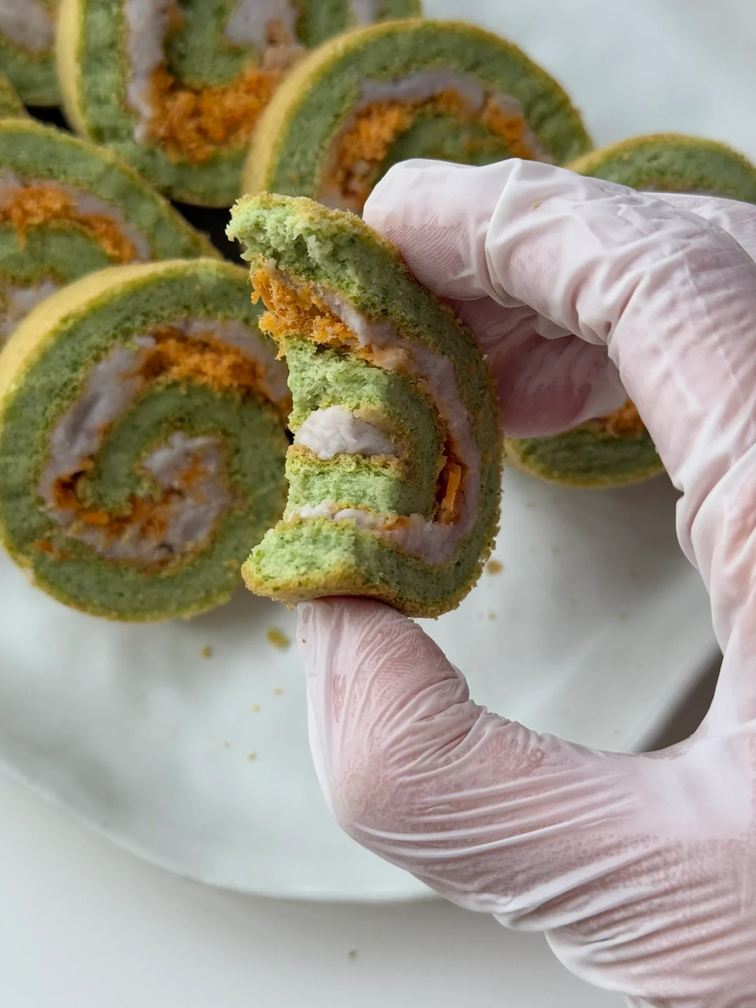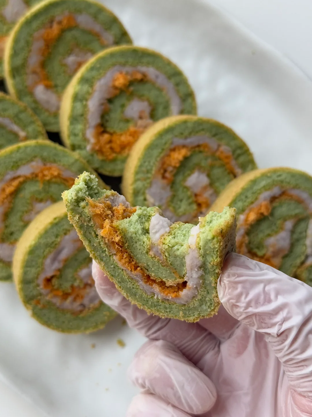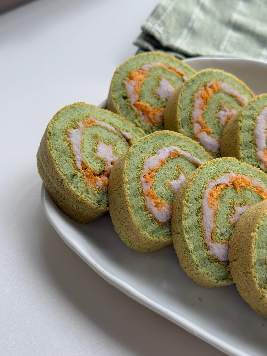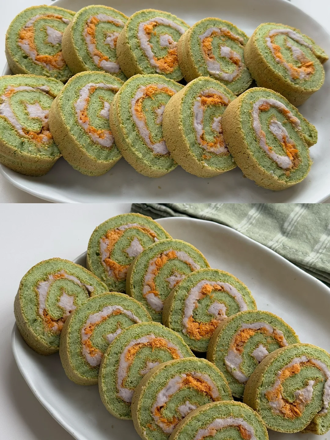 低卡健康菠菜蛋糕卷(内陷:无糖肉松芋泥)