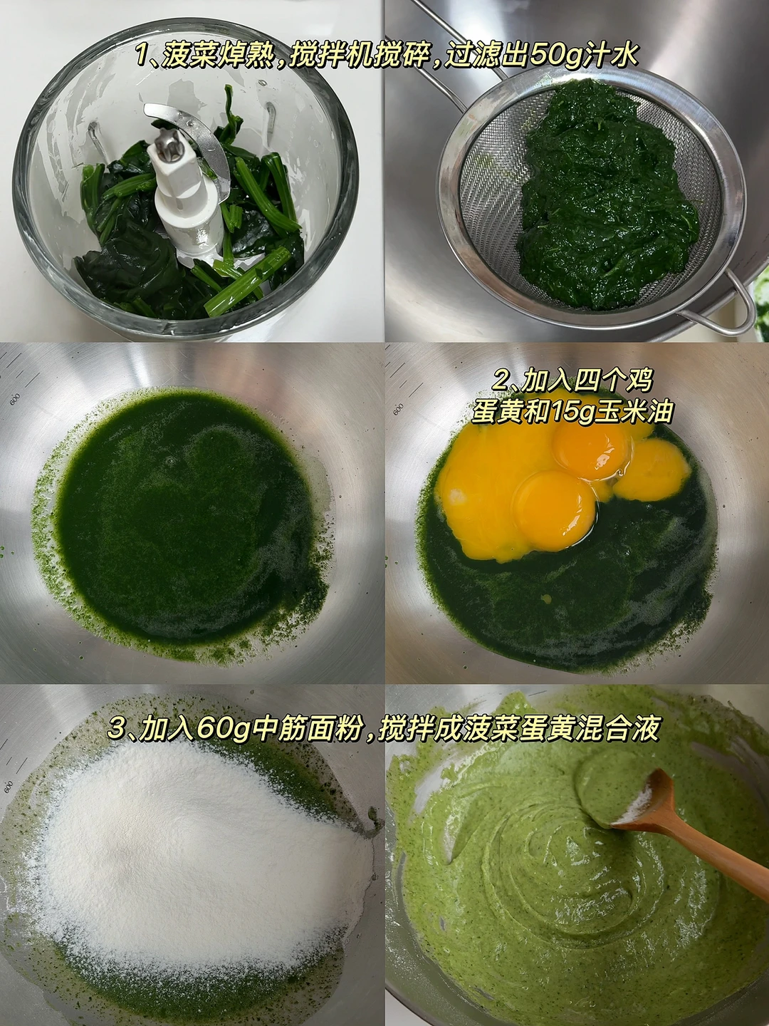 [向右R]外皮食材:鸡蛋4个、中筋面粉60g(有低筋的更好)、菠菜汁50g、玉米油15g、糖10g