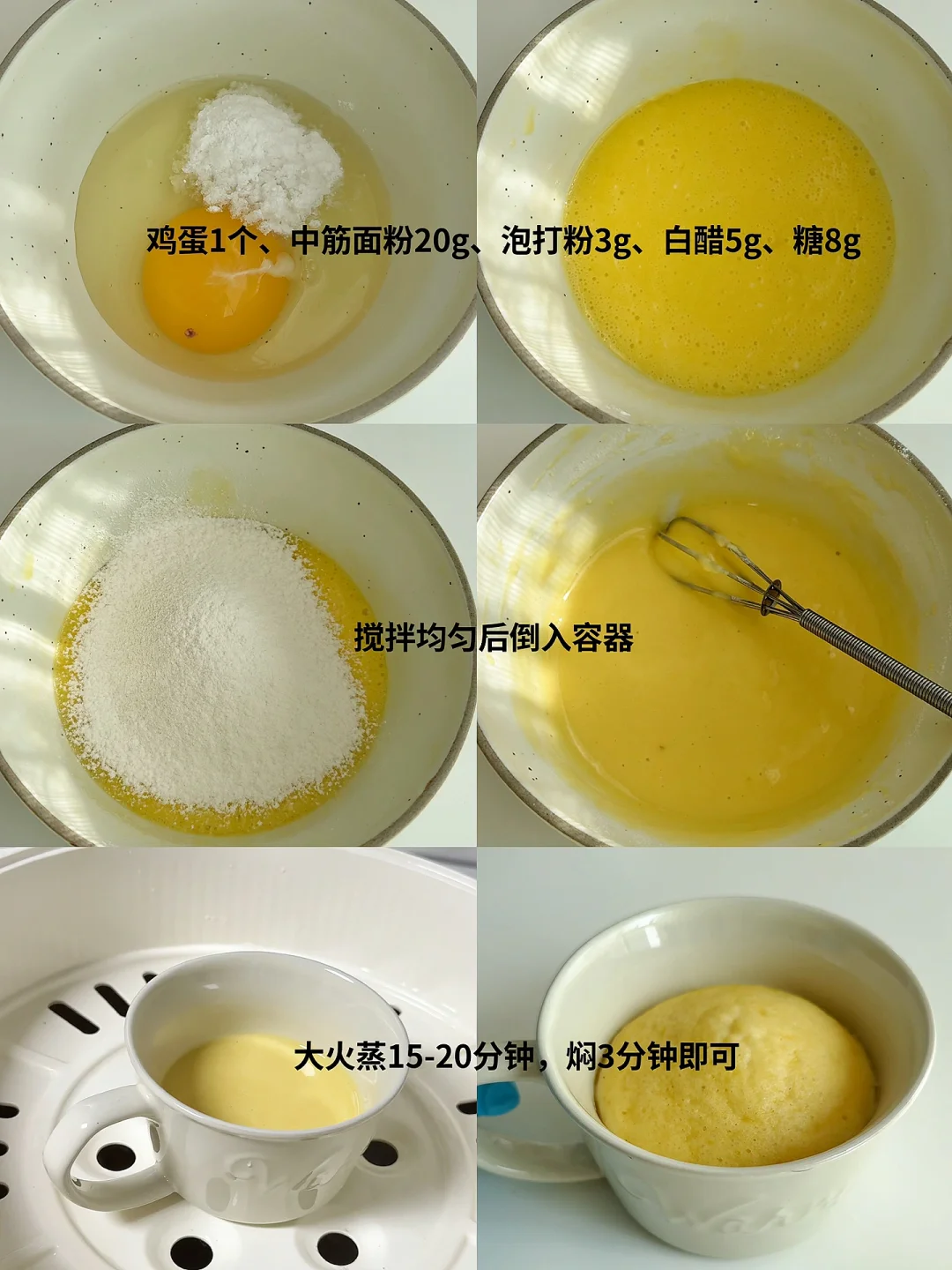 [向右R]食材:鸡蛋1个、中筋面粉20g、泡打粉3g、白醋5g、糖8g(可不加)