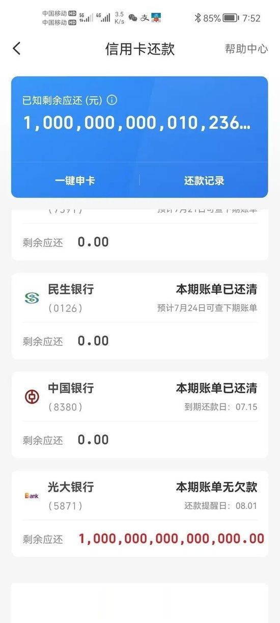 针对“1000万亿元的巨额欠款”一事,光大银行客服则表示,不排除第三方平台显示有误的可能。