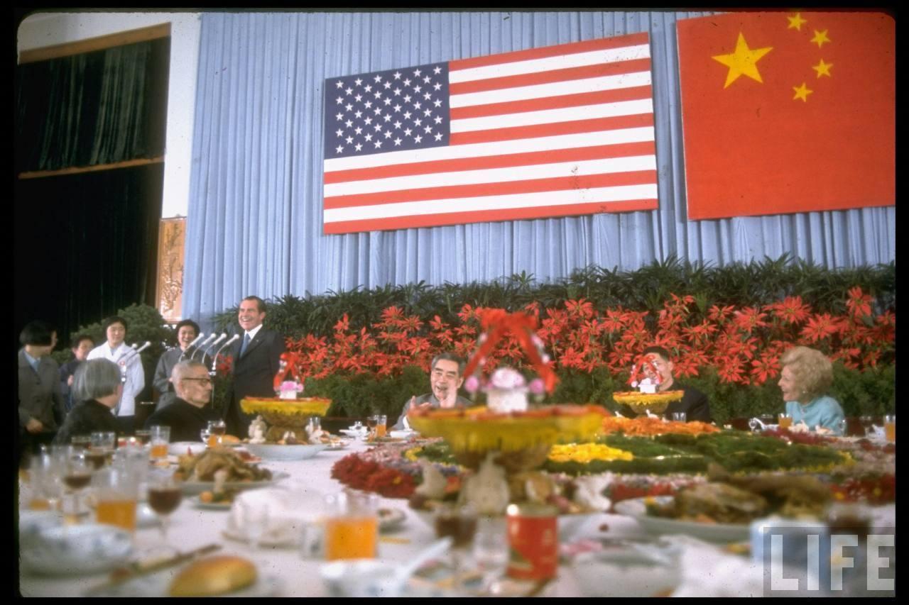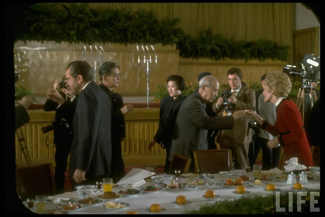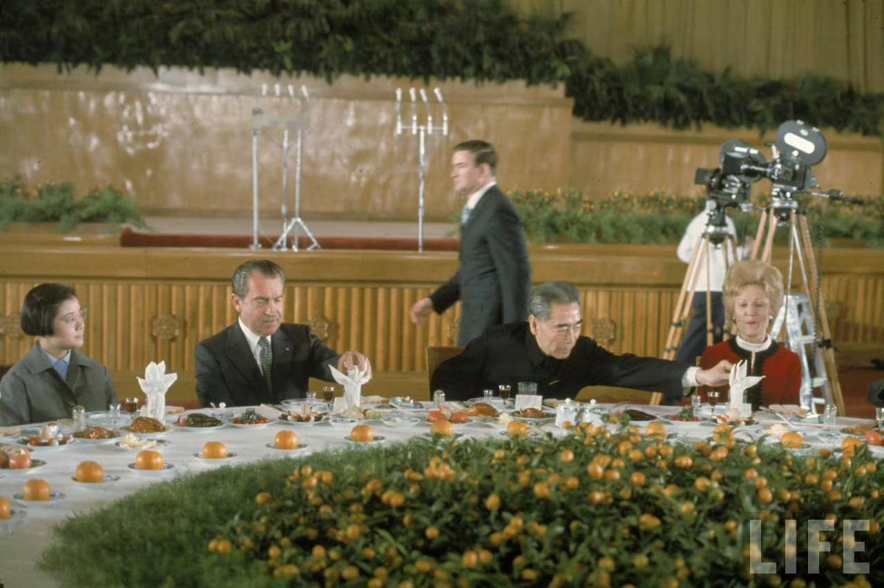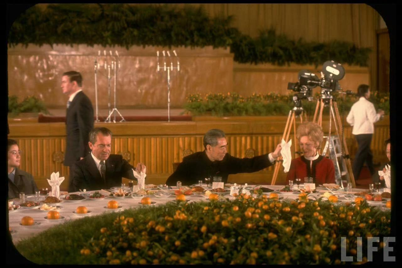 美国《LIFE》杂志摄影师约翰·多米尼斯拍摄,1972年2月21日周总理在人民大会堂举行国宴接待美国总统尼克松。