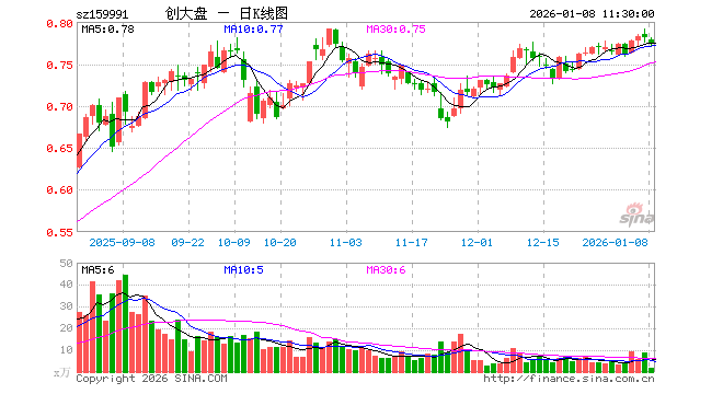 1月8日,截止午间收盘,创大盘ETF(159991)跌0.90%,报0.774元,成交额124.48万元。创大盘ETF(159991)重仓股方面,宁德时代截止午盘跌0.12%,中际旭创跌2.72%,东方财富跌2.00%,新易盛跌1.74%,阳光电源跌2.38%,胜宏科技跌2.58%,汇川技术跌0.15%,迈瑞医疗涨0.33%,亿纬锂能跌0.72%,同花顺跌4.28%。